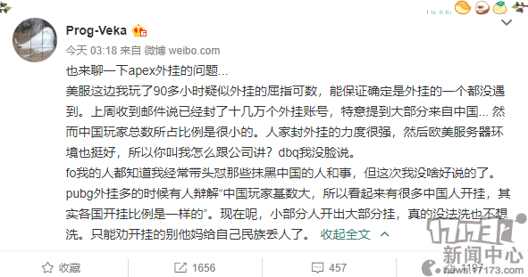 当下《Apex英雄》的火爆已经不言而喻,游戏上线一个月玩家数量就已经突破5000万。不过随着游戏的火爆,外挂问题也开始变得严重起来,相信不少玩家已经能够感受到最近游戏中碰到外挂玩家的几率已经开始大幅度提升。面对外挂泛滥的问题,今日微博上一位在重生娱乐工作的微博网友@Prog-Veka发表了自己的看法。微...